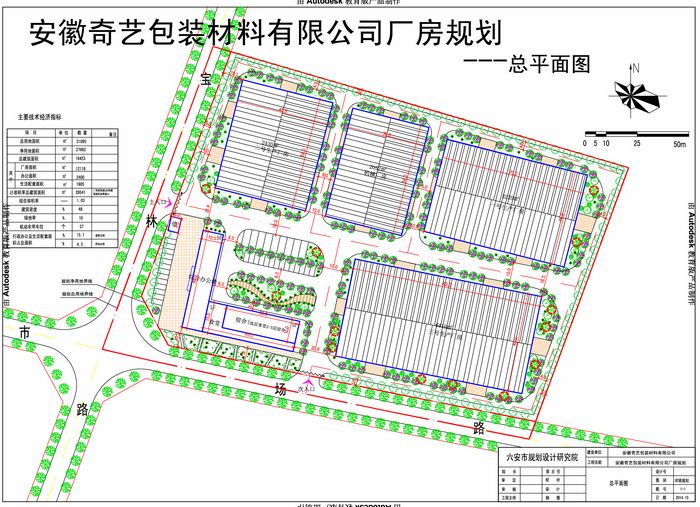 由安徽奇艺包装材料有限公司建设的安徽奇艺包装材料有限公司厂区详细规划项目位于裕安开发区,宝林路与市场路交叉口东北侧。该项目由六安市规划设计研究院设计,净用地面积27662平方米,计容总建筑面积约28541平方米,容积率1.03,建筑密度48%,绿地率10%。