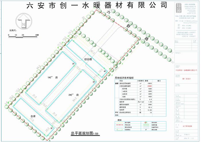 由六安市创一水暖器材有限公司建设的年产2000吨塑料管材项目位于金安区施桥镇工业园内。该项目由深圳市筑道建筑工程有限公司设计,规划总用地面积19970平方米,容积率1.04,建筑密度42.5%,绿地率12.8%。计容总建筑面积20860平方米,其中综合楼建筑面积4560平方米,1#车间建筑面积5840平方米,2#车间建筑面积5840平方米,仓库建筑面积4620平方米。