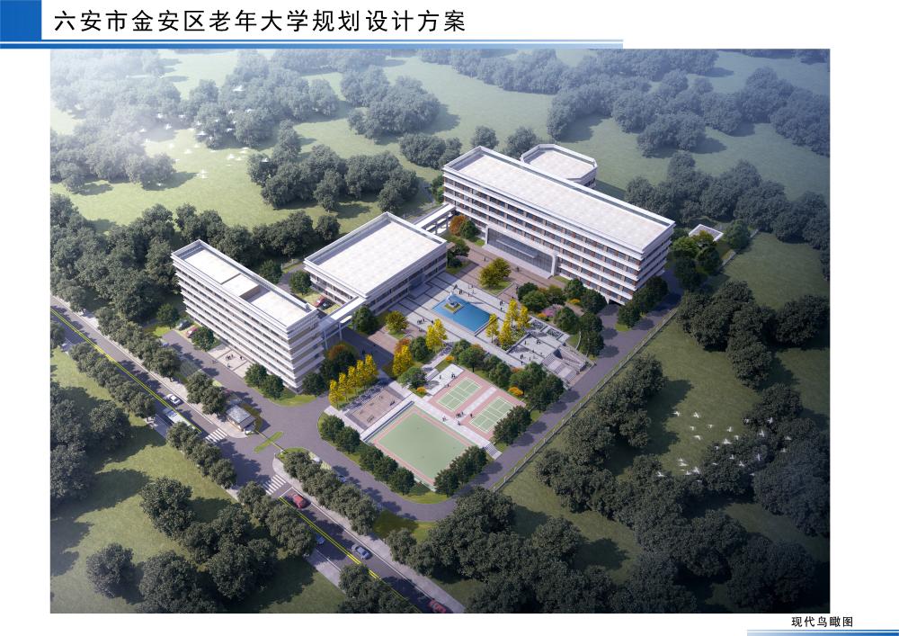 由六安市金安区老干部服务中心建设的金安区老年大学项目,位于龙河东路以东、龙河东苑安置房东侧,该项目由安徽华凯规划建筑设计咨询有限公司设计,净用地面积18914平方米,总建筑面积17425平方米(包含现状3160平方米),容积率0.74,建筑密度21.01%,绿地率35%。