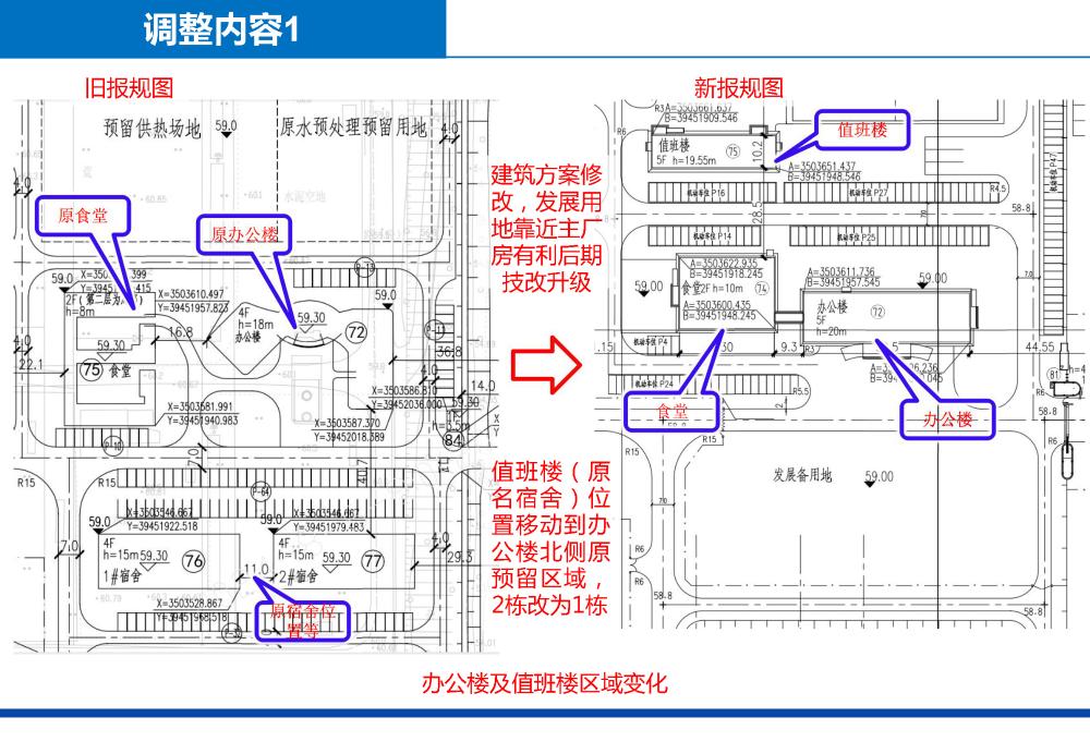 1.厂前区值班楼由2栋(1#、2#宿舍)4F调整为1栋5F,位置由办公楼南侧调整至北侧,建筑面积由6048平方米调整为2177平方米;办公楼外轮廓调整,层数由4F调整为5F,食堂外轮廓和位置微调,办公楼和食堂建筑面积由6600平方米调整为5900平方米。