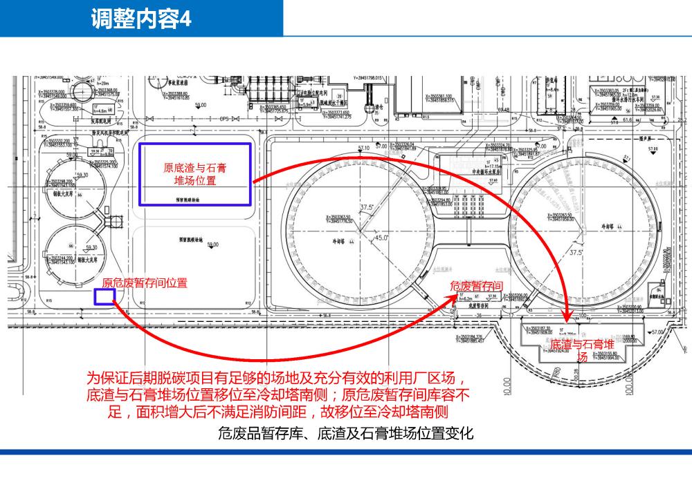 4.危废暂存间移位至冷却塔南侧,建筑面积需由220平方米增加到300平方米;底渣与石膏堆场位置移位至冷却塔南侧,建筑面积由3000平方米调整为2900平方米。