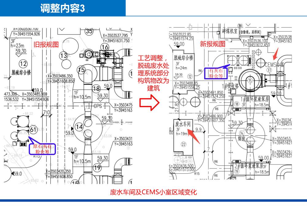 3.石灰石粉仓(构筑物)位置调整;脱硫废水处理系统部分构筑物改为建筑;原石灰石粉仓处增建废水车间3F,建筑面积约1300平方米。
