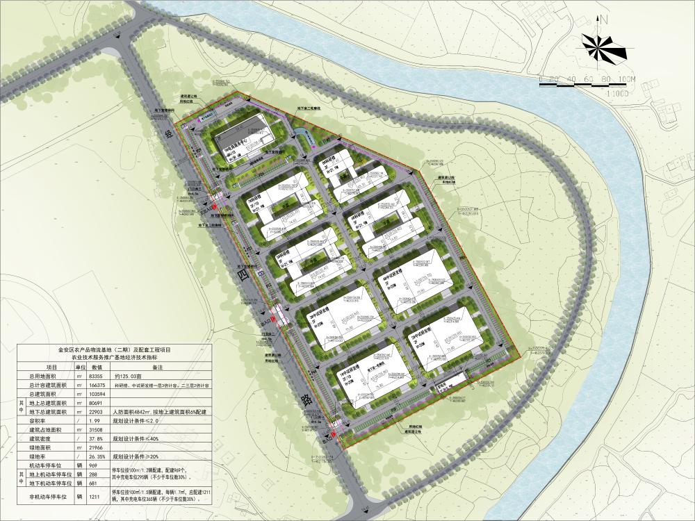 由安徽金安农业开发有限公司建设的金安区农产品物流基地项目,位于金安区先生店镇月牙山片区经四路东侧。该项目由中铁上海设计院集团有限公司设计,净用地面积83355平方米,总建筑面积103594平方米,容积率1.99,建筑密度37.8%,绿地率26.35%。