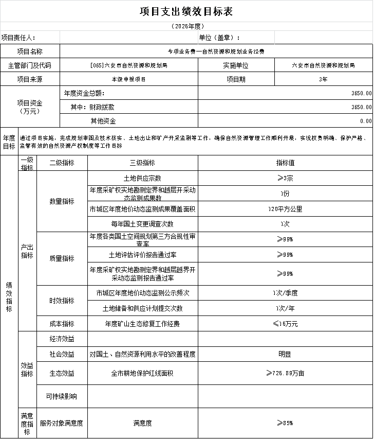 14.六安市自然资源和规划局2026年项目支出绩效目标表(附件表14)