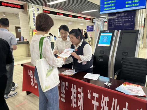 为进一步引领全社会践行绿色发展理念,大力倡导绿色低碳生产生活方式,市不动产登记中心5月16日开展了以“绿色转型 节能攻坚 推动‘无纸化办公’”为主题的宣传活动。