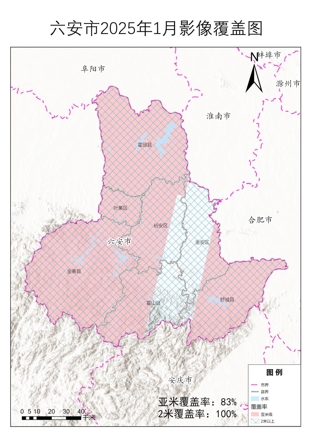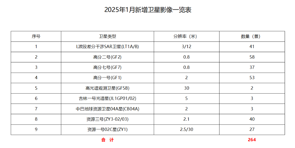 2025年1月,六安市卫星应用技术中心新增卫星影像264景,其中2米级以上影像覆盖率100%,亚米级影像覆盖率为83%,具体情况如下: