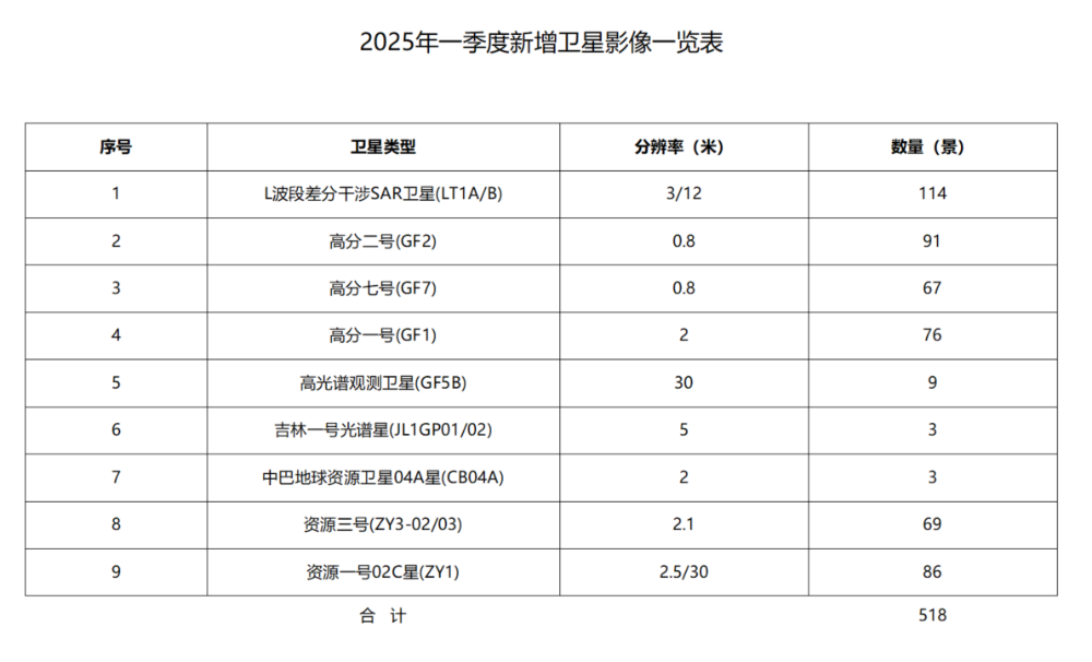 2025年一季度,六安市卫星应用技术中心新增卫星影像518景,其中2米级以上影像覆盖率100%,亚米级影像覆盖率约为100%,具体情况如下: