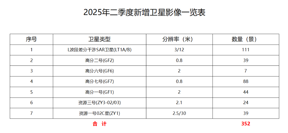 2025年二季度,六安市卫星应用技术中心新增卫星影像352景,其中2米级以上影像覆盖率100%,亚米级影像覆盖率约为73%,具体情况如下: