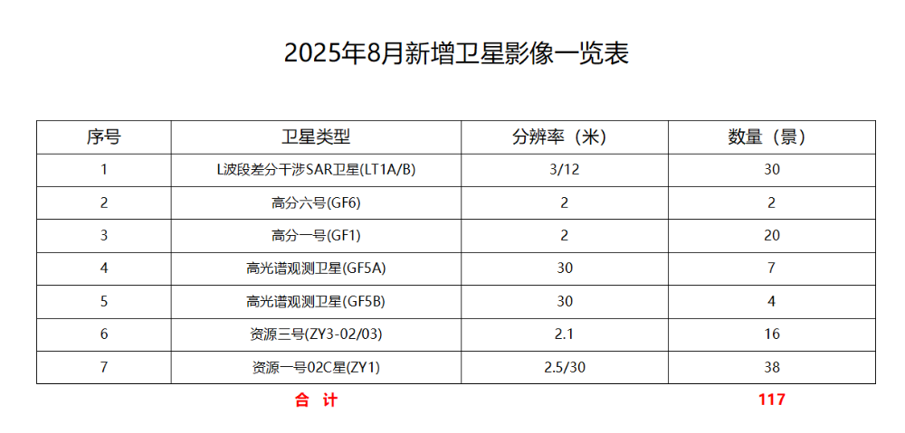 2025年8月,六安市卫星应用技术中心新增卫星影像117景,其中2米级以上影像覆盖率100%,亚米级影像覆盖率约为0,具体情况如下: