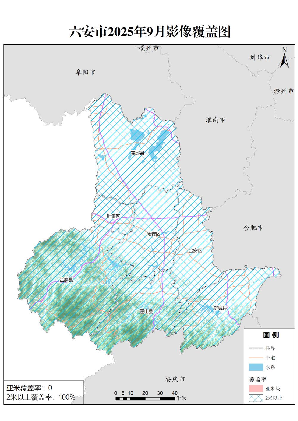 2025年9月,六安市卫星应用技术中心新增卫星影像83景,其中2米级以上影像覆盖率100%,亚米级影像覆盖率约为0,具体情况如下: