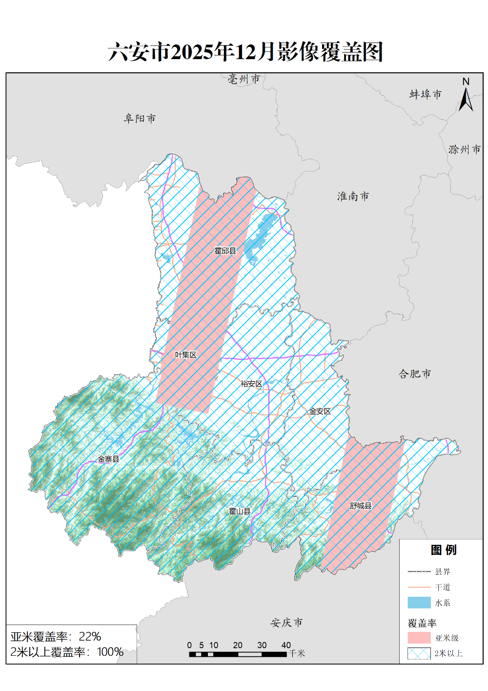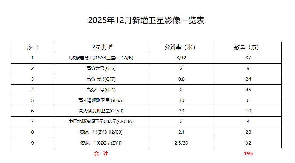 2025年12月,六安市卫星应用技术中心新增卫星影像195景,其中2米级以上影像覆盖率100%,亚米级影像覆盖率约为22%,具体情况如下:
