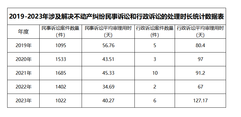 2019-2023年涉及解决不动产纠纷民事诉讼和行政诉讼的处理时长统计数据表