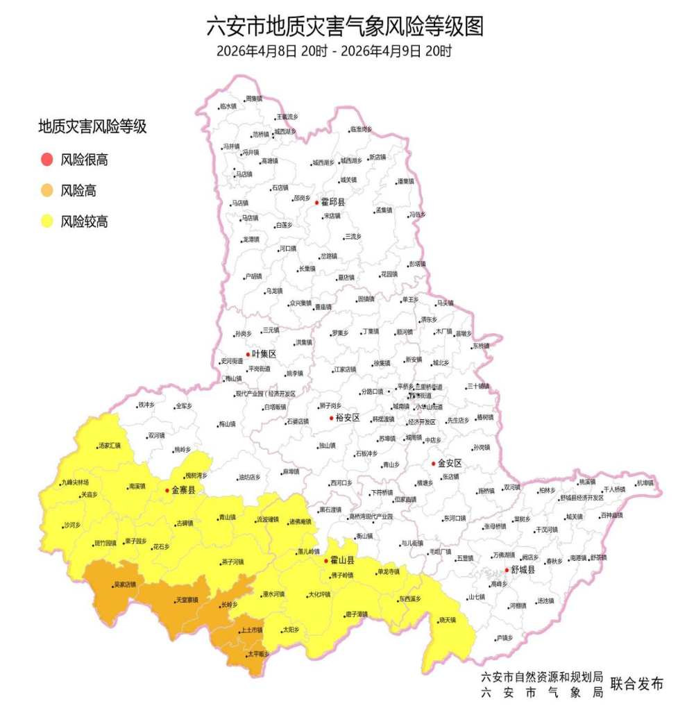 六安市自然资源和规划局、六安市气象局联合发布地质灾害气象风险预警:2026年4月8日20时至2026年4月9日20时,金寨县(天堂寨镇、吴家店镇、长岭乡),霍山县(上土市镇、太平畈乡)发生地质灾害的可能性大(Ⅱ级,橙色), 请以上地区密切关注降雨情况,加强对预警区域地质灾害隐患点和地质灾害风险区的巡查与监测频次,做好受威胁群众转移准备;加强值班和领导带班,24小时在岗在位,保持信息畅通;发生地质灾害灾情、险情,及时做好应急处置并立即上报。金寨县(青山镇、燕子河镇、古碑镇、斑竹园镇、汤家汇镇、南溪镇、流波䃥镇、槐树湾乡、花石乡、沙河乡、果子园乡、关庙乡),霍山县(佛子岭镇、诸佛庵镇、落儿岭镇、磨子潭镇、大化坪镇、漫水河镇、单龙寺镇、东西溪乡、太阳乡),舒城县(晓天镇)发生地质灾害的可能性较大(Ⅲ级,黄色), 请密切关注本区域降雨情况,加强值班、监测、巡查。一旦发生地质灾害灾情、险情,请立即做好应急处置工作,并按规定速报。