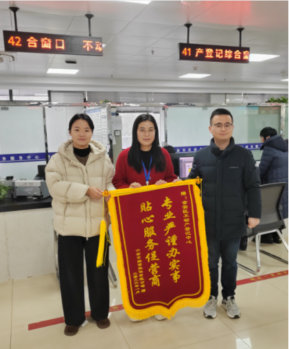 高效便民的服务不仅惠及个人,也为企业发展提供了有力支持。1月,本地一家中小企业因扩大生产急需办理厂房抵押融资,但部分材料需补充完善。中心企业服务专窗启动“绿色通道”,安排专人对接指导,协调相关部门加快审核,并在材料齐备后加班完成登簿制证,确保企业及时获得贷款。“从咨询到领证,全程都有工作人员耐心指引,还为我们加班办理,实实在在感受到了营商环境的优化。”企业负责人深有感触。三天后,该企业代表专程来到大厅,将一面写有“专业严谨办实事,贴心服务促营商”的锦旗送到窗口,对中心的高效专业服务表达诚挚谢意。