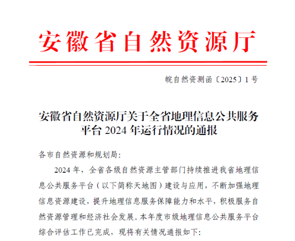 近日,安徽省自然资源厅印发《关于全省地理信息公共服务平台2024年运行情况的通报》,六安市地理信息公共服务平台(“天地图•六安”)2024年度综合评估满分成绩排名全省第一,连续6年被评估为“五星级”平台。
