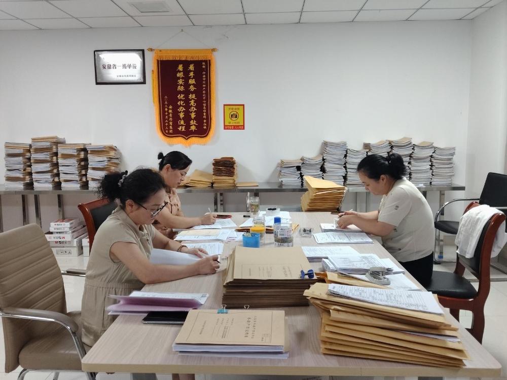 六安市不动产登记中心工作人员正在整理档案