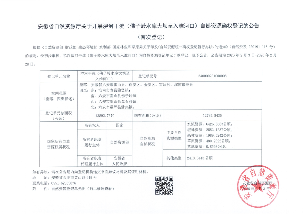 安徽省自然资源厅关于开展淠河干流(佛子岭水库大坝至入淮河口)自然资源确权登记的公告(首次登记)